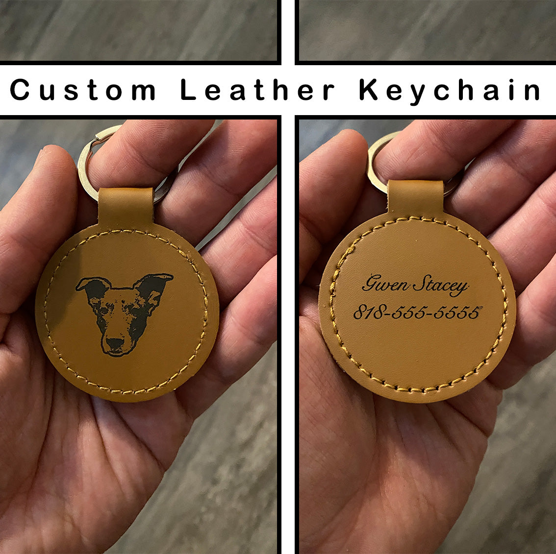 Unique, customizable leather keychain. Can include your own images, text, QR codes, etc. Perfect for logos, photos of your kids, gifts for family, affordable bridesmaid gift, or wedding favors. Bring your pets with you wherever you go or represent whatever makes you... you!