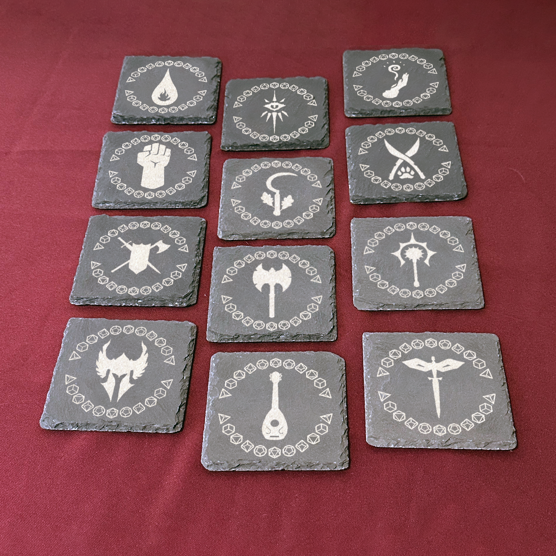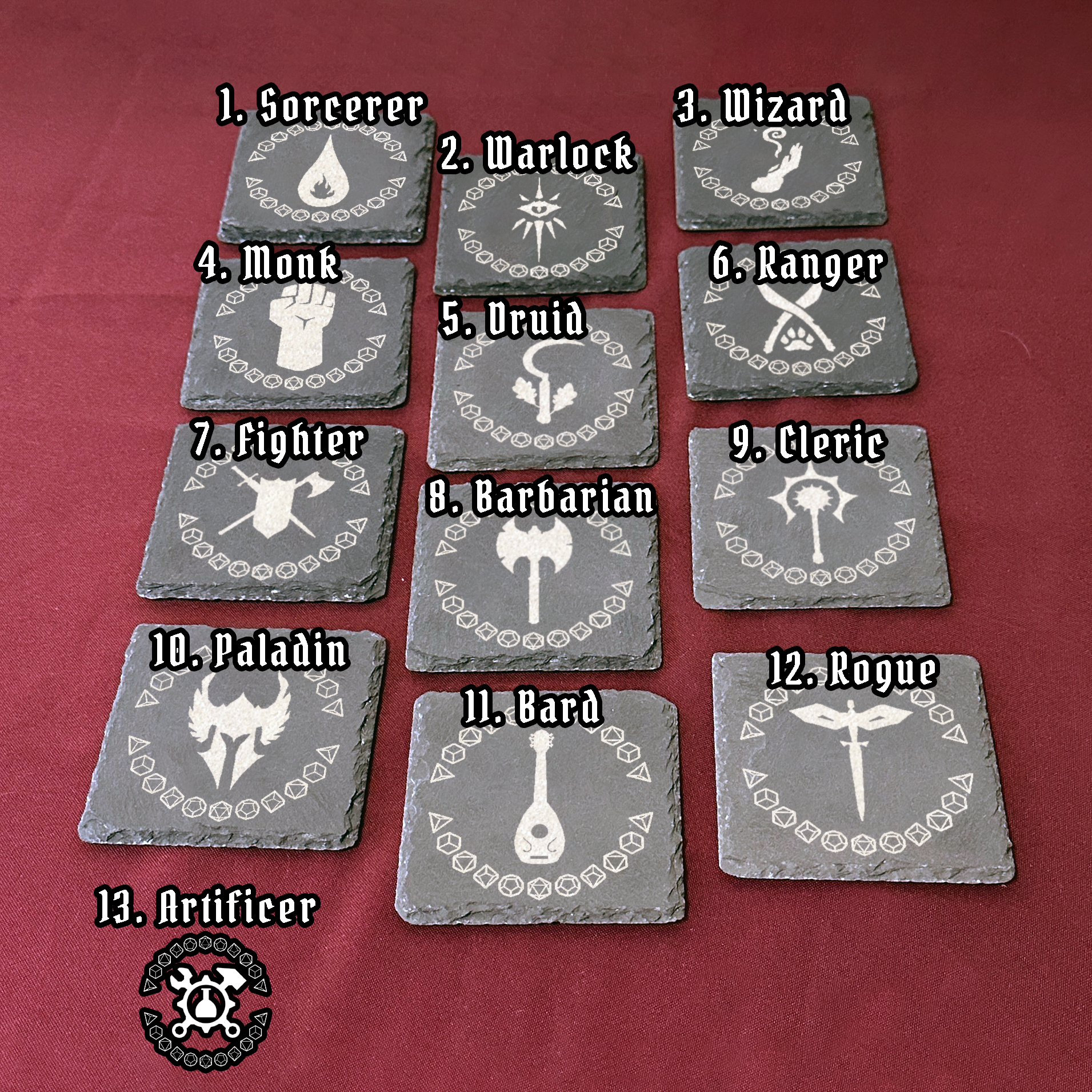 A natural rustic slate coaster, or a light durable cork coaster laser etched with the D&D classes of your choice!