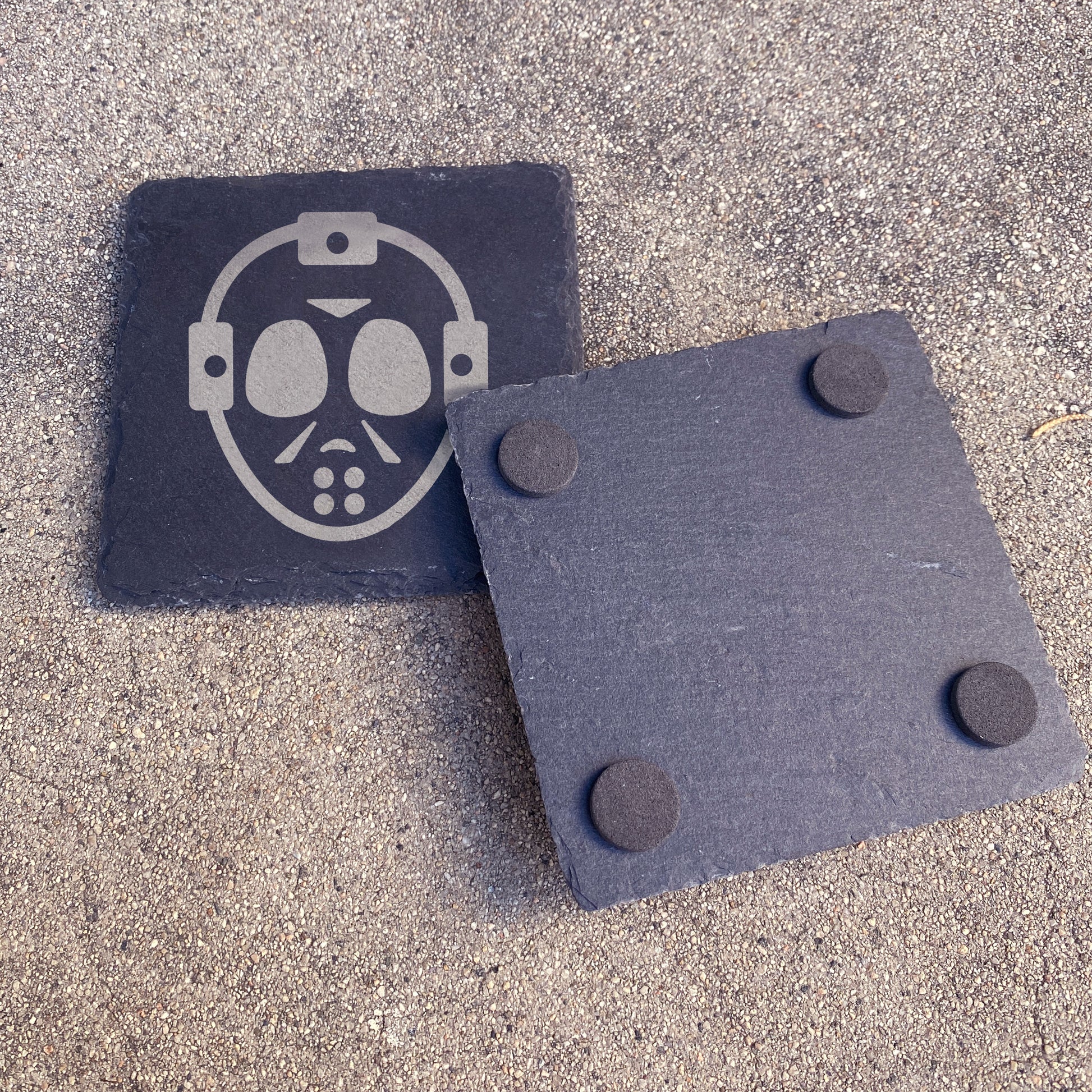 A natural rustic slate coaster laser etched with designs from classic horror franchises!