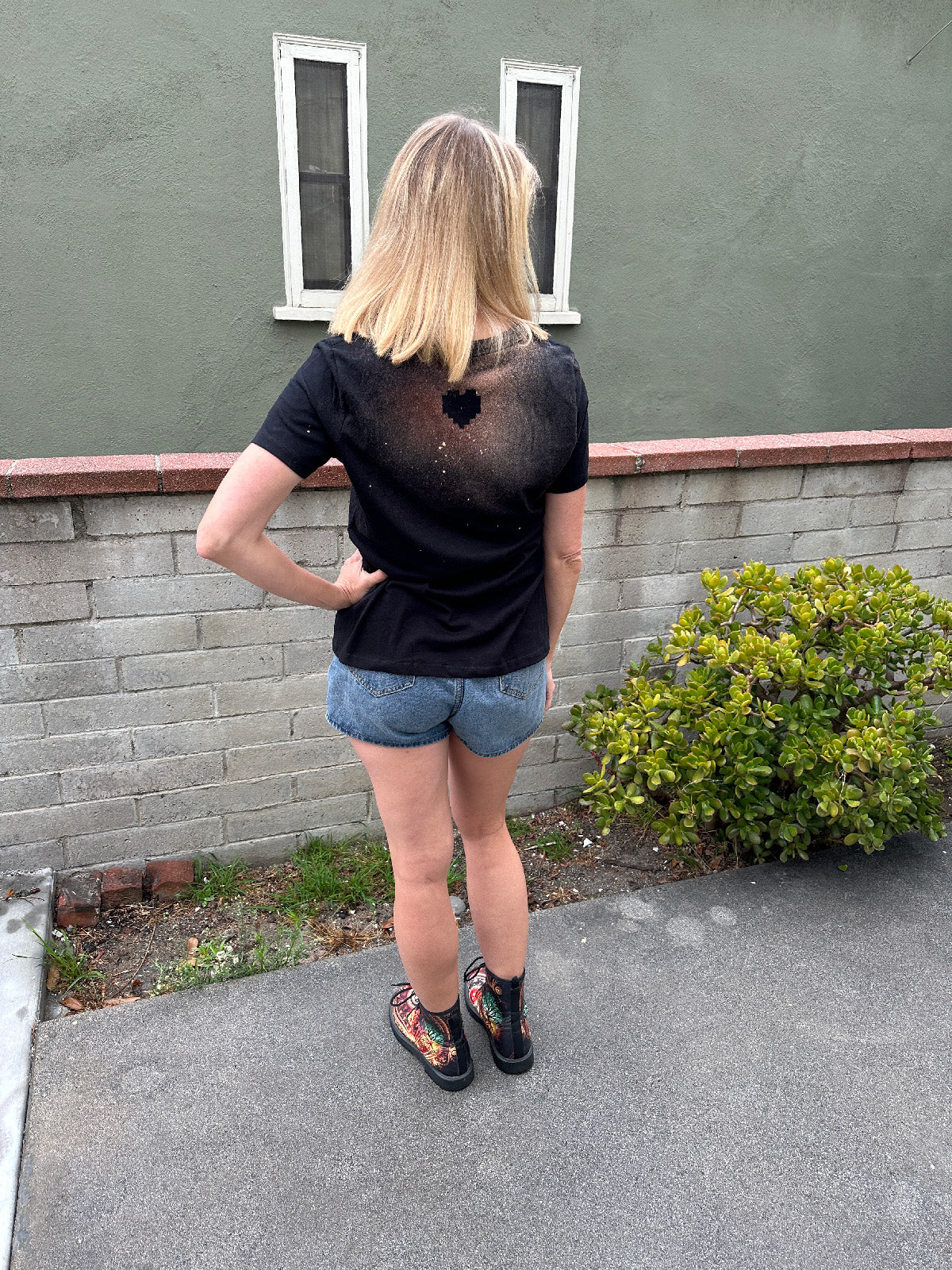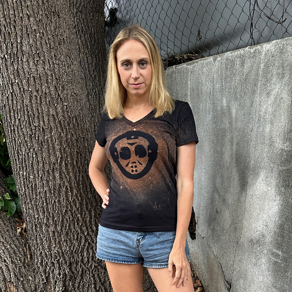 The unique design is handmade, using a stencil and bleach, ensuring that each shirt will be similar but unique in its splatter. The colors may vary slightly, particularly on non-black tshirts, but the design will not grow dull or crack.